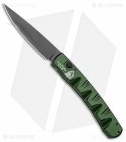 This Virus knife has a black finished blade with a plain edge and green anodized aluminum handle with tactical black finished hardware and pocket clip.