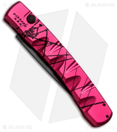 This Virus knife has a black finished blade with a partially serrated edge and pink anodized handle with tactical black finished hardware and pocket clip.