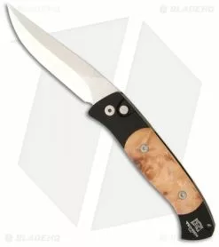This Brend 2 automatic knife has a satin finished 154-CM steel blade and black anodized T6 aluminum body with maple burl inserts. Satin hardware and black pocket clip.