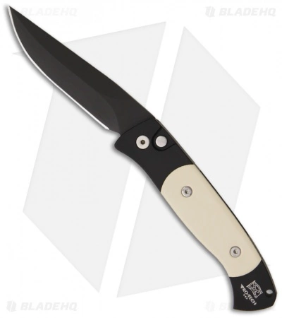 This Tuxedo style Brend 2 automatic knife has a black finished 154-CM steel blade and black anodized T6 aluminum body with ivory Micarta inserts, satin hardware and a black pocket clip.