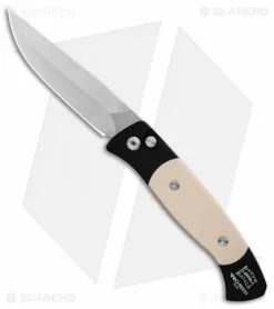 This Tuxedo style Brend 2 automatic knife has a satin finished 154-CM steel blade and black anodized T6 aluminum body with ivory Micarta inserts, satin hardware and a black pocket clip.