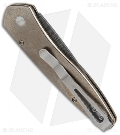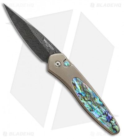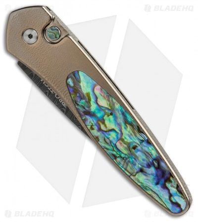 This custom Newport knife has a Chad Nichols stainless Damascus steel blade and a bronze anodized, orange peel textured titanium handle with a mosaic abalone inlay and matching push button insert. The pocket clip and hardware have a satin finish.