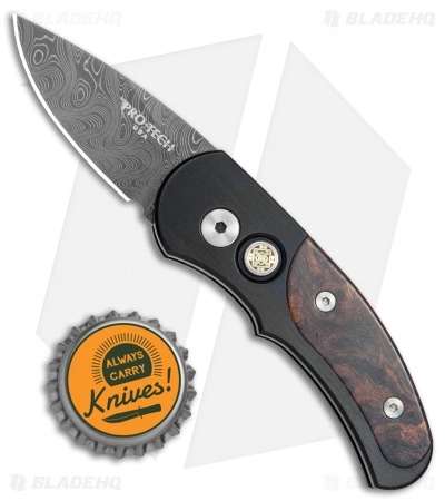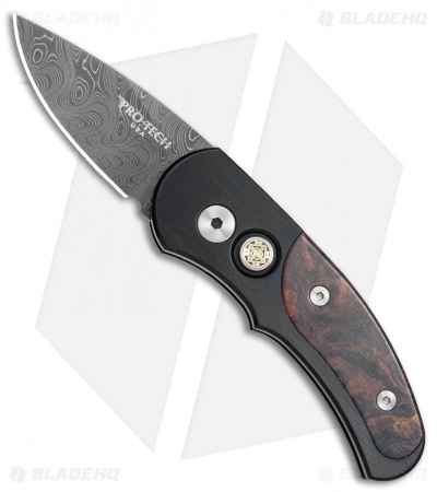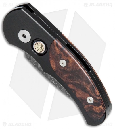 This custom J4 Runt features a black aluminum handle with jewelry grade desert ironwood inlays, a mosaic pin push button, and a hand forged Damascus steel blade. Includes a satin finished titanium pocket clip.