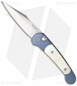 This Custom Monaco knife is stunning! It features a hand satin finished, blue anodized titanium frame. The handles are inlaid with beautiful gold lip pearl and a matching inlay on the firing button. The photo just doesn’t do the pearl justice, it is deep and has a gold tint, which is an excellent accent to the blue frame.