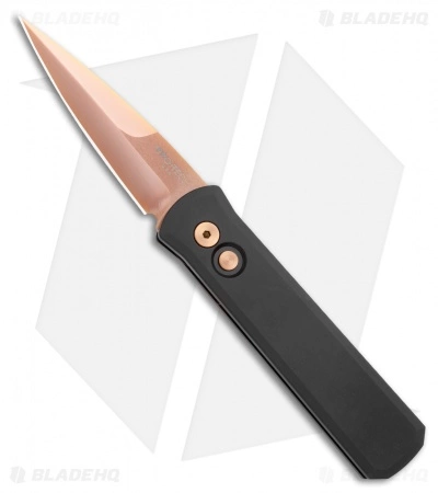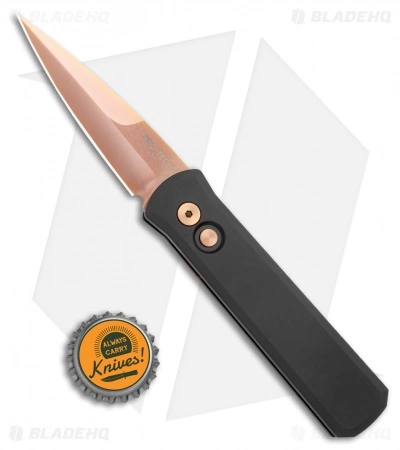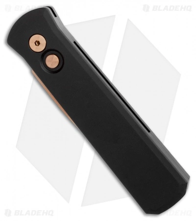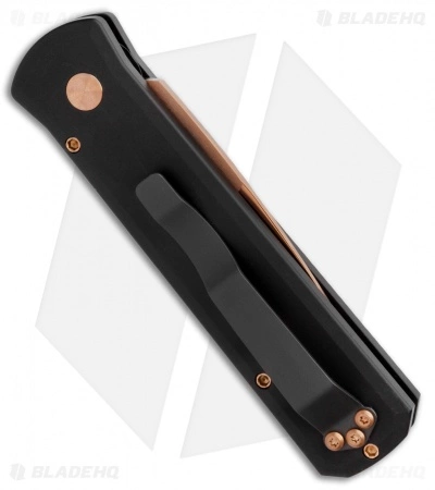This Godson has a rose gold finished 154-CM steel blade with a plain edge. The handle is solid black anodized T6-6061 aluminum. Black finished TiNi tip-up pocket clip for easy carry.