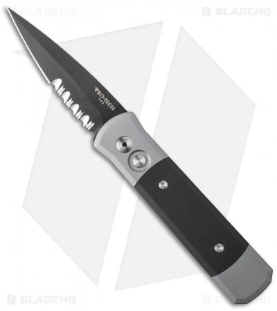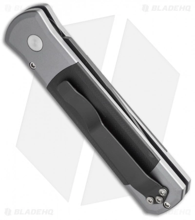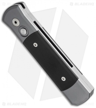This Godson has a black finished 154-CM steel blade with a partially serrated edge. The handle is gray anodized aluminum with black G-10 inlays. Black finished TiNi tip-up pocket clip and satin hardware.
