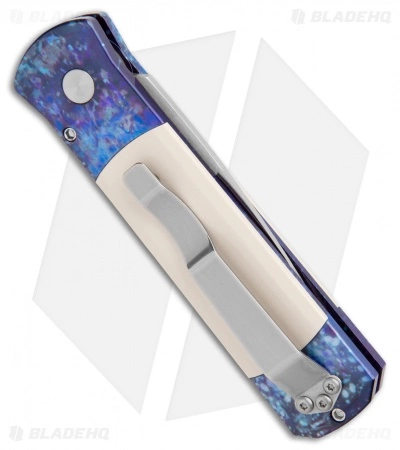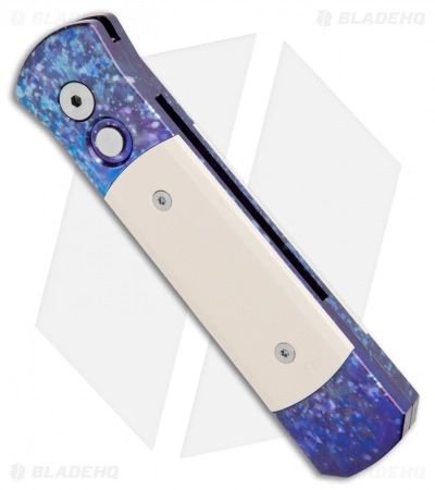 This Godson has a 154CM blade with a plain edge. The handle is anodized T6-6061 aluminum with ivory micarta inlays. A satin finished tip-up pocket clip for easy carry.
