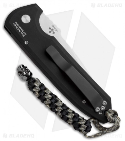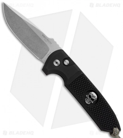This production collaboration is an impressive adaptation of the custom Les George Rockeye with Pro-Tech’s signature automatic action. It has a steel blade with a stonewash finish. The front side of the blade bears the Pro-Tech logo, while the back side has the George cross. The handle is black anodized 6061-T6 aluminum. The Rockeye is outfitted with a tip-up carry pocket clip. This is a Pro-Tech, so the action, lockup, fit and finish are all top-notch.