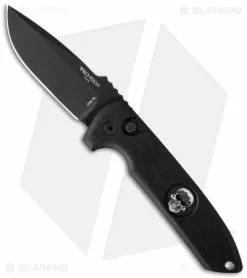 This production collaboration is an impressive adaptation of the custom Les George Rockeye with Pro-Tech’s signature automatic action. It has a CPM-154 steel blade with a black DLC finish. The front side of the blade bears the Pro-Tech logo, while the back side has the George cross. The handle is black anodized 6061-T6 aluminum. The Rockeye is outfitted with a tip-up carry pocket clip. This is a Pro-Tech, so the action, lockup, fit and finish are all top-notch.