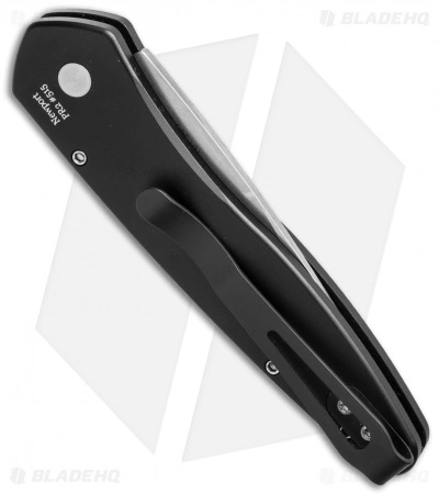 This Newport knife has an S35-VN steel blade with a stonewash finish. The black anodized aluminum handle features a black G-10 inlay. Satin hardware and a black tip-up carry pocket clip.