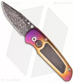This Runt 2 knife from Protech is a collection-worthy piece. It features a hand mirror polished titanium frame that is “fade” color anodized. The handle and push button inlays are carbon fiber and the pocket clip is titanium, colored to match the frame. This Runt 2 has a Robert Eggerling Damascus blade with a stunning pattern.