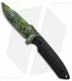 This Pro-Tech Rockeye fixed blade collaboration is an impressive adaptation of the custom Les George design. It has a “Zombie Splash” Cerakote finished steel blade; the front side of the blade bears the Pro-Tech logo, while the back side has the George cross. The handle is black G-10 with a custom machined texture.
