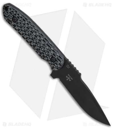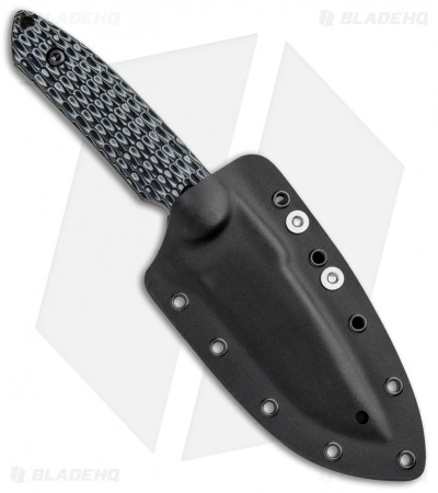 This Pro-Tech Rockeye fixed blade collaboration is an impressive adaptation of the custom Les George design. It has a black DLC finished steel blade; the front side of the blade bears the Pro-Tech logo, while the back side has the George cross. The handle is layered black/gray G-10 with a custom knurl-like texture. The Rockeye includes a kydex sheath for secure carry.