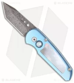 This custom Runt 3 has a blue anodized mirror polished titanium frame with a pearl inlay. The tanto blade is premium Chad Nichols Damascus. Matching blue anodized titanium pocket clip for tip-down carry. The firing button also has a pearl button to match the inlay. This knife comes in a black gift box. While the Runt’s size is small, it feels very good in the hand and has superb action and locks up solid. That’s what you expect and get from Pro-Tech Knives.
