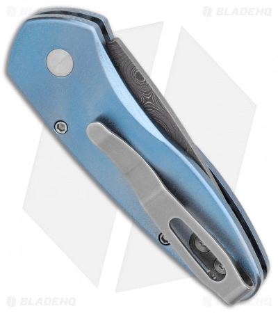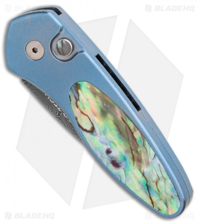 This Sprint Custom is a limited edition automatic knife with an Abalone inlay and matching push button insert. The blade is Chad Nichols stainless steel Damascus and the handle is blue anodized titanium.
