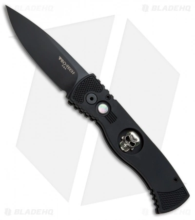This limited edition run TR-2 knife features a mother of pearl push button and a Bruce Shaw designed sterling silver skull set into the black anodized aluminum handle. The stainless steel blade is black finished. This knife, like all Pro-Tech knives, fires hard and feels great in hand. These knives are serial numbered on the handle, only 200 made!
