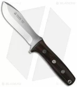 The El Nu Hunting knife by Puma knives features beautiful handmade quality and a classic fixed blade design. It comes equipped with a full tang, drop point blade made from 440C stainless steel in a satin finish. Ebony wood handle scales and a nickel silver guard add an impressive look to the knife. It includes a custom brown leather sheath with a lanyard cord and buckle snap. The El Nu Hunting knife will make the perfect addition to your fixed blade collection.