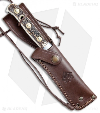 Having the right tool for the job can make any task so much easier. The Puma Stag Horn Skinner is just the tool you need when processing your next trophy. The generous 5.125″ trailing point blade is easily controllable with plenty of belly. A jimped thumb ramp locks the blade securely in hand for precision or more powerful cuts. True naturally dropped stag antlers are affixed to the blade by attractive brass rivets while the nickel silver bolsters provides an additional layer of safety. Easily carried with the included leather belt sheath, the Puma Stag Horn Skinner is sure to serve you for years to come.