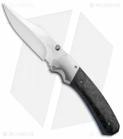 Making fine custom knives is in their blood, and this Freedom Fighter by Rainy and son Cory Vallotton is evidence of the claim. It’s a dual-action automatic with a push button release and thumb stud opener. The clip point style blade is hollow ground and satin finished ATS-34 stainless steel. Carbon Fiber and satin finished titanium bolsters sit atop the blue and purple anodized titanium liner lock frame. The liners and 440C stainless steel back spacer are hand filed.