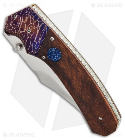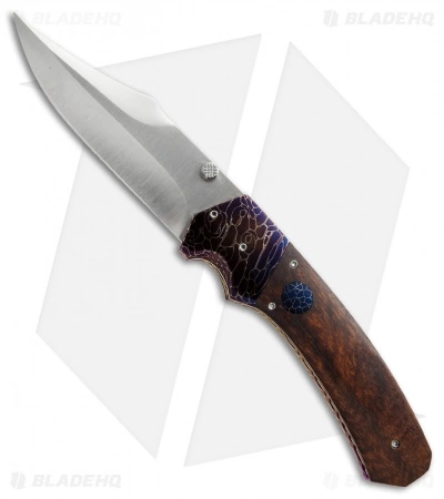 Making fine custom knives is in their blood, and this Freedom Fighter by Rainy and son Cory Vallotton is evidence of the claim. It’s a dual-action automatic with a push button and thumb stud opener. The clip point style blade is hollow ground ATS-34 stainless steel with a satin finish. Fine wood scales and Chad Nichols “Roses” Damascus steel bolsters sit atop the gold anodized titanium liner lock frame. The liners and 440C stainless steel back spacer are hand filed.