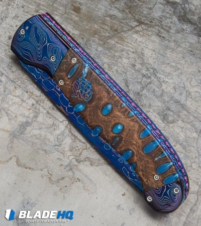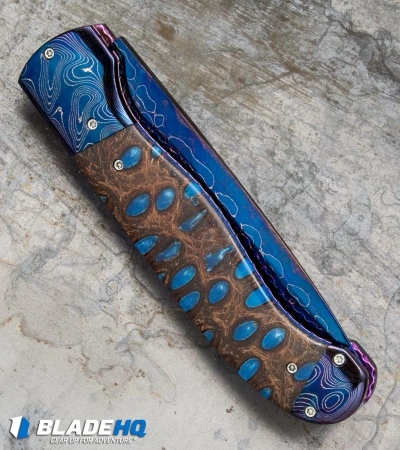 This custom Titan automatic knife offers a fine hand-made design by Rainy Vallotton. It has a Chad Nichols “Lizard Skin” Damascus blade and “Boomerang” bolsters. The handle features highly unique blue resin burl scales, purple anodized titanium liners and a stainless steel backspacer. The liners and backspacer are filed, adding a nice touch and texture to the knife. This Titan model is equipped with a floating titanium back spring for fast and reliable opening action.