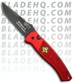 Randall King’s automatic Swift Striker II is a great knife with a super price. The ATS-34 blade is black finished and laser etched with “SWIFT STRIKER II, MADE IN THE USA, ATS-34” and has a copy of the designer’s signature. The blade comes razor sharp, fires with a nice snap and locks securely into place. The knife body is anodized red T-6 aluminum. It’s got a good feel and we’re quite impressed with the overall quality. There’s a sliding safety on the back that works flawlessly and a pocket clip to make carry easy. Comes in a metallic gift box.