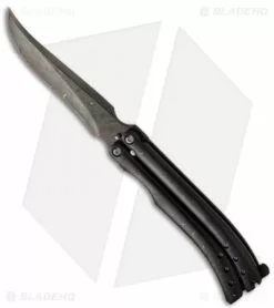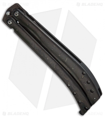 This Toxic Persian from Reese Weiland features an exquisite Brad Vise blued Damascus steel blade with hollow grinds and an upswept tip. The handles are also blued titanium with black G-10 back spacers and latch. This Reese Weiland custom balisong has first-class fit and finish.