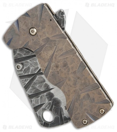 The RichMade Zombie Killer is a beast of a knife built to withstand apocalyptic level conditions. This handmade monster offers a cleaver blade made from thick A-2 tool steel. The beefy titanium frame lock handle has a bronze anodized finish with a matching bronzed pocket clip. Hand carved grooves in the handle and blade add a truly unique touch to the design.