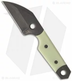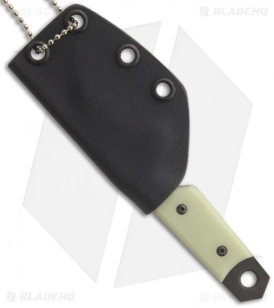 This Wharncliffe Dashi neck knife from Sam Eddleman has an acid washed D2 steel blade with hollow grinds and the Eddleman Knives logo up front. The handle has Moon Glow scales, making this one easy to find in the dark. This knife comes with a Kydex sheath and ball chain for neck carry.