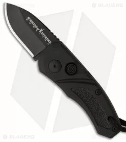 This knife is fully automatic and California legal. The Extreme Survival features a black finished 440 stainless steel with a drop point design. The knife has black powder coated T6 aluminum handles with a grip insert. A convenient lanyard is included. The action on these Schrades are lightning fast, and the knife has a great, smooth feel. Its compact size fits well in the pocket.