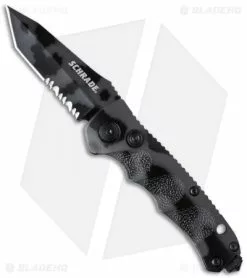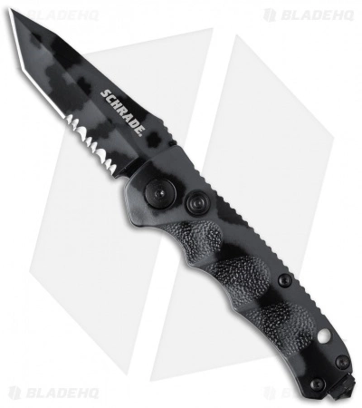 Whether it’s for everyday tasks or urgent situations, Schrade’s SC60MCTS automatic knife has what you need. This model features an urban camo coated blade and handle. The serrated tanto blade is designed for general utility tasks you encounter, while the glass breaker tip is available in case of emergency. The aluminum handle features sculpted and textured grips to improve safety and handling. The push button release gives fast action and secure lock up. A tip-up pocket clip and lanyard hole mean you will always have this blade within easy reach when you need it.