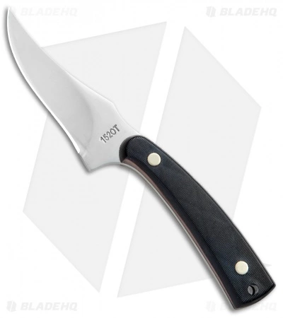 - 6.75″ fixed blade knife with a satin finish and a plain edge.