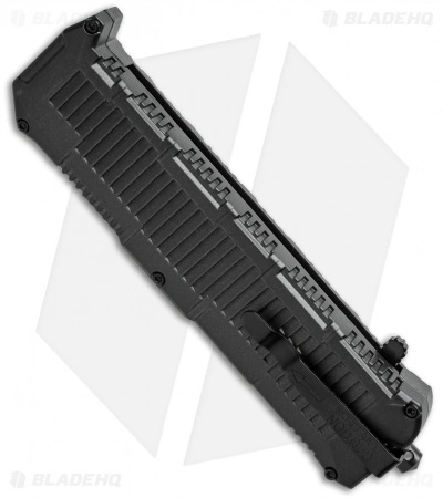 Schrade’s Viper OTF looks like a design from the future. The double-edged partially serrated spear point blade is made of AUS-8 high carbon stainless steel with a black finish. The futuristic handle is crafted from black aluminum so it’s lightweight and easy to manage. To open the blade, switch off the safety lock and press the sliding release forward. The knife opens fast and smoothly, and the lock up is tight. To close the blade, push the small blade release button forward, the slide the blade back with the bottom actuator until it locks into place. The pommel of this knife features a small glass breaker tip and a removable, tip-down carry pocket clip.