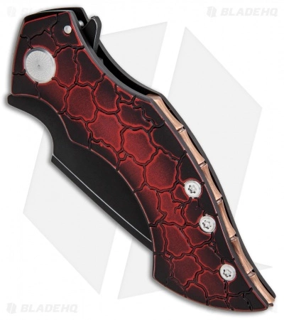 Add an impressive handmade Sergey Rogovets design to your collection with the Venom flipper knife. This model features a black modified wharncliffe blade with a recurve edge and a black and red titanium handle. Satin finished hardware and a copper bone backspacer add a nice contrast to the piece. Item includes a matching titanium pocket clip and a steel reinforced lock bar.