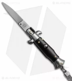 This 4″ Keychain Stiletto from SKM Italy comes in the classic style with a black handle and a satin finished blade. SKM makes a variety of Italian stilettos featuring traditional designs at an affordable price. This 4″ model has a black handle with stainless steel bolsters. Brass pins add a classic finishing touch to the piece. The blade has a flat grind with a plain edge and a satin finish. Experience the affordable Italian quality of these authentic stilettos from SKM Italy.