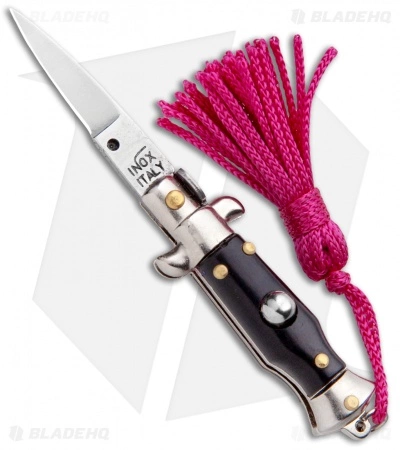 Introducing the adorable, the tiny, and the unfailing 2.75″ Italian Stiletto from SKM. This one features a black handle and a pink tassel. This key-chain knife is constructed with a nickel silver frame and brass pins. When the button is pushed, the 1.125″ satin blade will flick open so fast you won’t be able to see it. The blade locks in place; simply pull the lock away from the blade with your fingernail to close the knife. It is fun, reliable, and useful for very small cutting tasks. Add one to your key-chain!