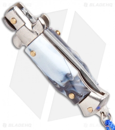 Introducing the adorable, the tiny, and the unfailing 2.75″ Italian Stiletto from SKM. This one features a marble handle and a blue tassel. This key-chain knife is constructed with a nickel silver frame and brass pins. When the button is pushed, the 1.125″ satin blade will flick open so fast you won’t be able to see it. The blade locks in place; simply pull the lock away from the blade with your fingernail to close the knife. It is fun, reliable, and useful for very small cutting tasks. Add one to your key-chain!