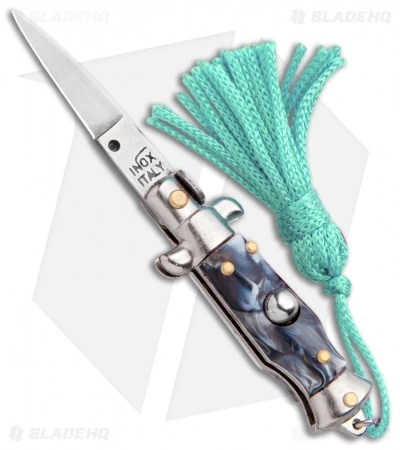 Introducing the adorable, the tiny, and the unfailing 2.75″ Italian Stiletto from SKM. This one features a marble handle and a teal tassel. This key-chain knife is constructed with a nickel silver frame and brass pins. When the button is pushed, the 1.125″ satin blade will flick open so fast you won’t be able to see it. The blade locks in place; simply pull the lock away from the blade with your fingernail to close the knife. It is fun, reliable, and useful for very small cutting tasks. Add one to your key-chain!