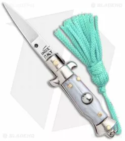 Introducing the adorable, the tiny, and the unfailing 2.75″ Italian Stiletto from SKM. This one features a silver colored handle and a teal tassel. This key-chain knife is constructed with a nickel silver frame and brass pins. When the button is pushed, the 1.125″ satin blade will flick open so fast you won’t be able to see it. The blade locks in place; simply pull the lock away from the blade with your fingernail to close the knife. It is fun, reliable, and useful for very small cutting tasks. Add one to your key-chain!