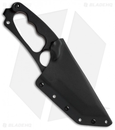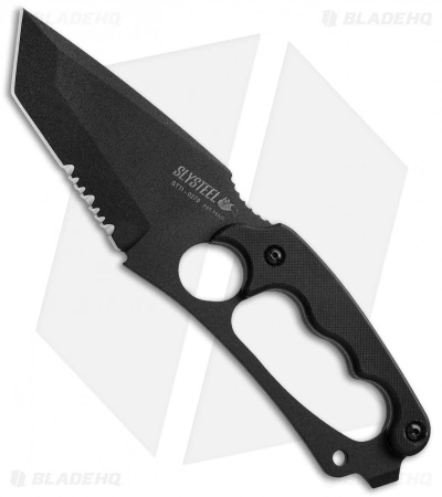 This SLYSTEEL Shark Tooth Tactical I fixed blade knife has a minimalist black handle with a black tanto blade that’s partially serrated.