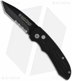 The SW50BTS has a black finished 440 stainless steel tanto style blade with a partially serrated edge. The black coated aluminum handle features grooves to increase grip and a tip-down stainless steel pocket clip for easy carry. The push button quickly deploys the blade and this new version of the SW50 has a front mounted safety!