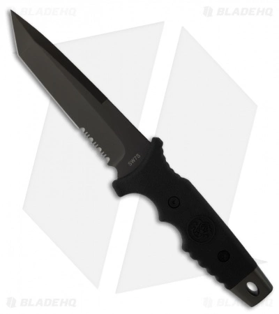 The Smith & Wesson SW7S fixed blade is a comfortable combat knife with an ergonomic rubber overmold handle featuring finger grooves and blade guards for slip-resistance. The partially serrated 9Cr17 steel tanto blade is titanium coated for tactical use. The included sheath is molded thermoplastic with a belt loop.