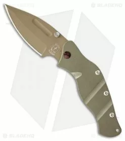 The LPC (Lance Personal Carry) is a combat oriented tool. The clip point chisel ground blade features a coyote brown GunKote finished CPM-154 steel with large thumb stud for opening. Features a bronze finished titanium frame lock handle with a textured green G-10 front slab and pocket clip.