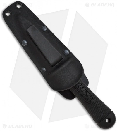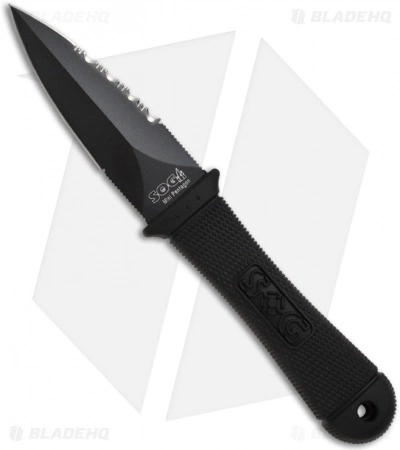 The SOG Pentagon Mini fixed blade is a tactical back-up knife that easily conceals in boot or vest. The Pentagon offers the instant choice between a serrated or beveled edge for cutting options. The twin thumb notches enable accurate blade orientation and downward control. The checkered handles are flared to provide confident gripping as well as superior feel and balance. Includes a Kydex sheath with clip and ball chain.