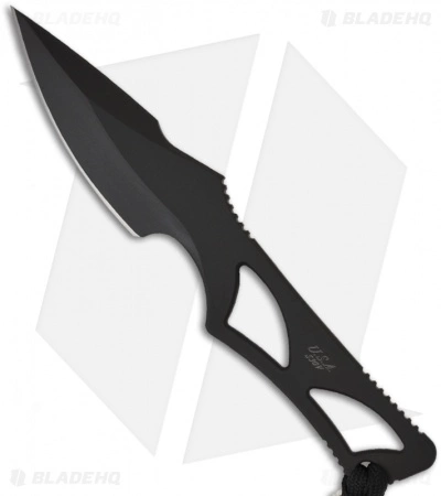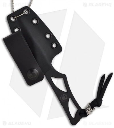 This Enyo knife has a black Tungsten DLC finished blade and skeletonized handle. Includes a Kydex sheath and neck chain.