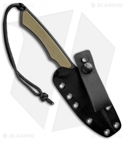 This Phrike knife has a flat black finish ZrN finished blade and an OD green G-10 inlay handle. Includes a black Kydex sheath.