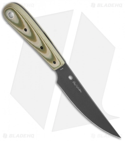This distributor exclusive Bow River fixed blade has a layered OD green and gray G-10 handle with a black finished blade.