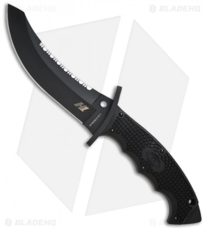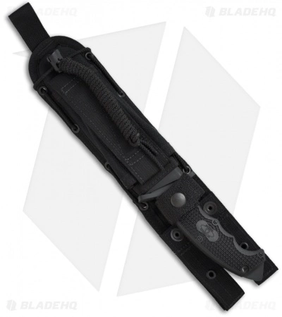 The Warrior combat knife from Spyderco features a black finished rust-free H-1 steel blade with a hollow-ground plain cutting edge and serrated edge spine portion. The skeletonized full-tang handle features FRN Bi-Directional Textured scales. Includes a black ballistic nylon sheath with Molle-vest attachment capability.
