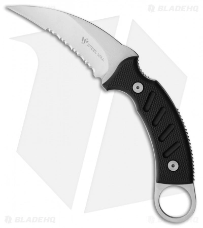 The Censor 1360S by Steel Will Knives is a fixed blade karambit knife excellent for combat or personal defense. Made with Japanese AUS-8 stainless steel, the 4″ partially serrated blade is an excellent slicer, making quick work of even tough materials like webbing, denim and ballistic nylon. The black TPR handles feature a prominent finger ring to accommodate a variety of hand positions. Jimping located on the finger choils and spine add additional traction to keep the knife firmly in hand. The black nylon MOLLE compatible sheath allows for a variety of carry options for secure carry and quick deployment.