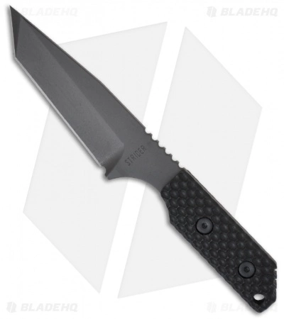 The CPM S30V tanto blade is multi-ground with a flat ground, razor sharp edge with a black tactical finish. The front tang is marked “STRIDER” and the back has the logo. Full tang construction makes this knife very solid. Handle is GG “Gunner Grip” black G-10 and features jimping on the thumb ramp. Includes heavy duty MOLLE compatible Kydex sheath system.